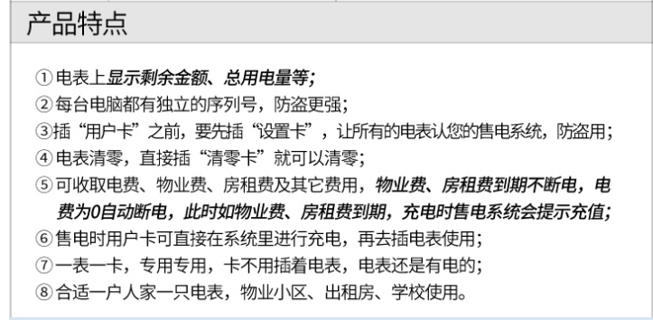 主要特點:應用計算機管理,先購電后用電;在額定電流范圍內能限制使用功率(由供電部門限定);一表一卡,??▽S?,失卡不失電,補卡再用;電卡能雙向傳遞數(shù)據(jù),能自動斷電告警用戶購電;電量為零時,自動拉閘斷電;并具有一定的防竊電軟件設計等。