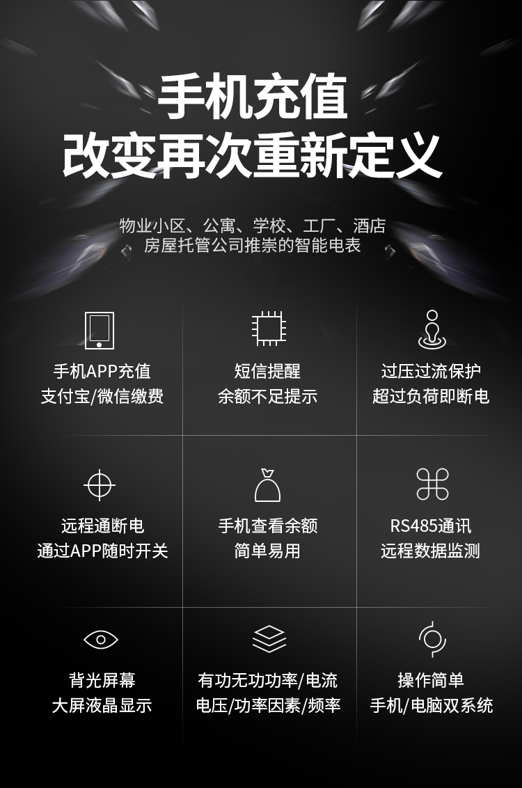 遠程充值預付費電表可與本公司遠程抄表系統(tǒng)和手機APP配套使用,遠程抄表管理系統(tǒng)具有實時抄表、定時抄表外,還提供了設備管理功能,如告警、余額短信通知、遠程充值、手機抄表、手機查詢、手機充值、預付費、后付費、自助充值機充值、遠程拉合閘、過壓過流保護、各種查詢報表、統(tǒng)計報表下載等功能。